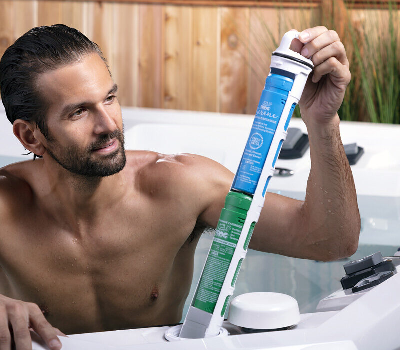 Floating or settled debris is removed from the spa’s interior. The acrylic is safely cleaned to remove any dirt and discoloration at the water line and filter housing.